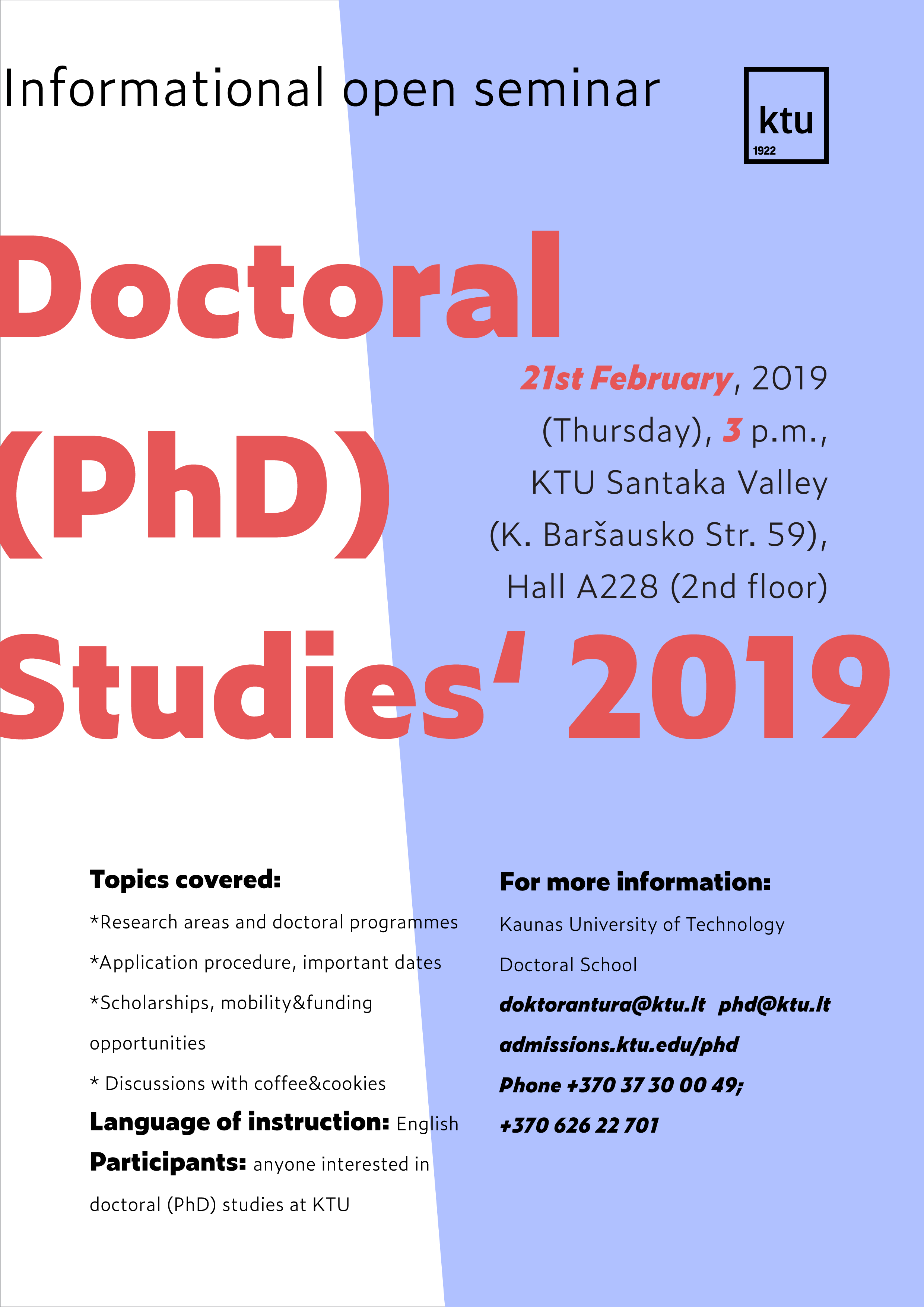 Kontaktai pasiteiravimui: el. p.: doktorantura@ktu.lt ; tel.: +370 37 30 00 49; 370 626 22701